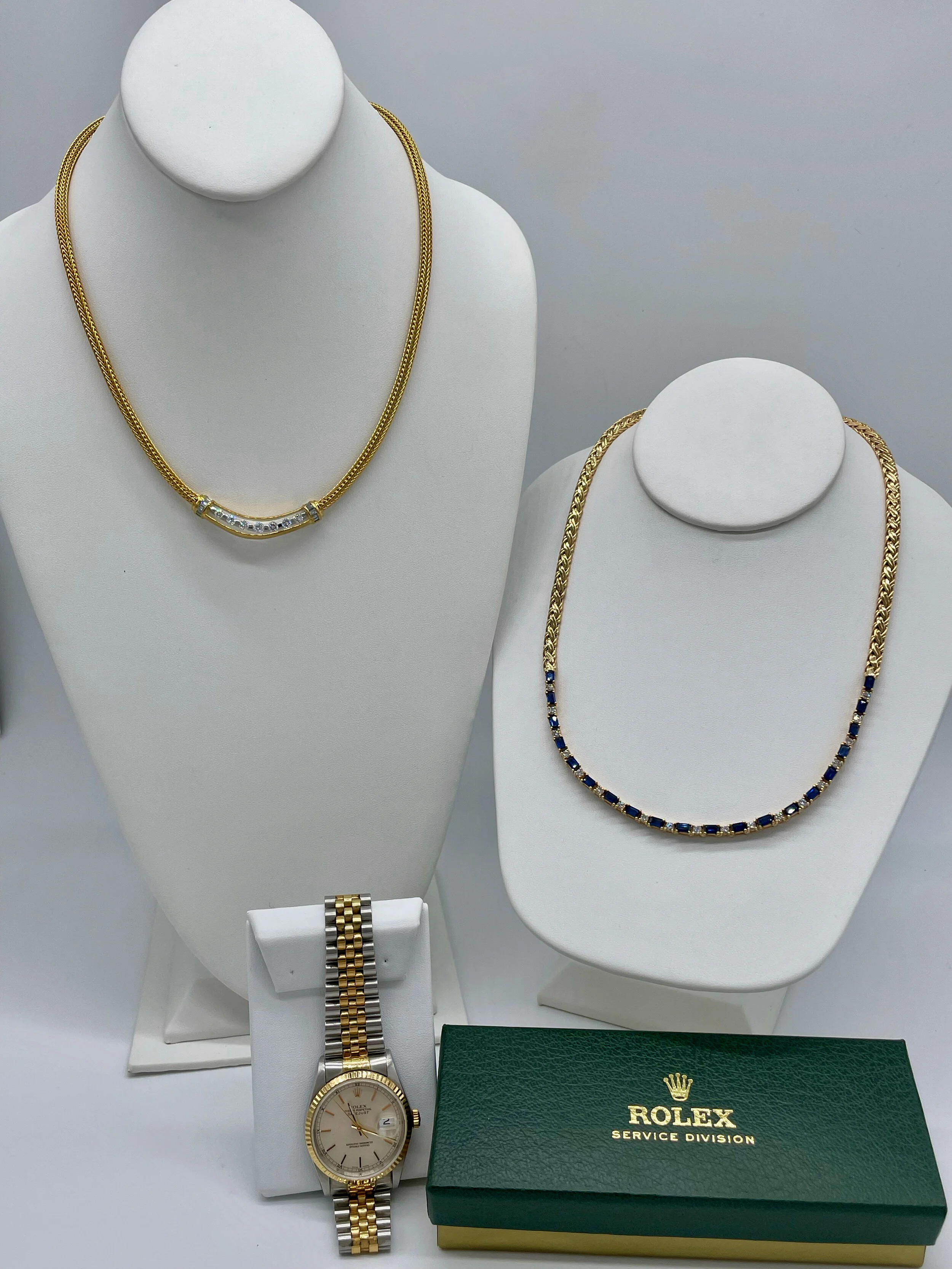 Distinguished home in Moreland Hills, Ohio decorated by Sedlak Interiors. Moving sale includes a large collection of fine jewelry, including men's and women's Rolex watches, diamond and sapphire jewelry, diamond and tanzanite jewelry, gold, silver, and more, a large Waterford collection, designer furniture by Henredon, Hickory, Hancock, and Moore, Stanley, rugs and more. Numerous golf accessories including an Electronic Putting Challenge green and a Peter Jacobsen's Golden Tee video arcade game. Beautiful outdoor furniture by Front Gate including loungers and cantilever umbrellas. Women's handbags including Coach and Brahmin, lady's shoes (size 9), mink hat, and more. Books, kitchenware, snow blower, wine refrigerator, decorative items, and more.